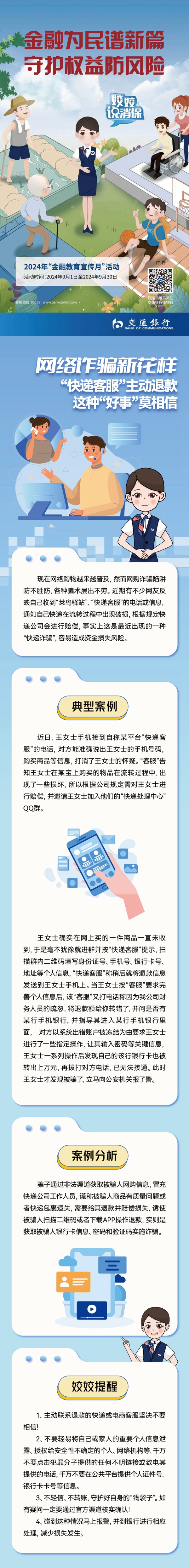 9月期間,交通銀行重慶市分行啟動2024年“金融教育宣傳月”活動,圍繞“金融為民譜新篇,守護權益防風險”主題推出“姣姣說消?!苯鹑谥R小課堂,通過案例、長圖、短視頻等形式,幫助公眾了解金融知識,認識金融風險,切實保護金融消費者合法權益。本期分享主題為《“快遞客服”主動退款?警惕網絡詐騙新花樣》。(交行重慶市分行供圖)