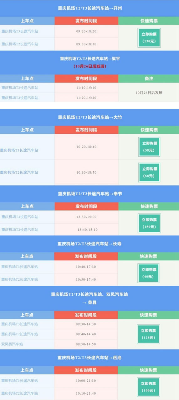 10月17日,愉客行消息,為更好滿足當前客運市場需求,助力廣大旅客出行,重慶機場T2長途汽車站、重慶機場T3長途汽車站、雙鳳橋汽車站新增開州、萬州、大竹等多條定制客運班線,車型以商務車為主。