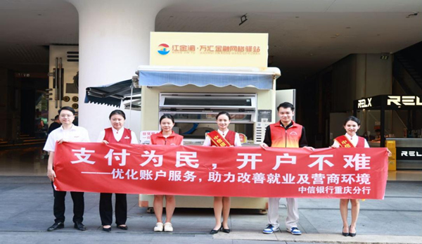 在紅金渝·萬匯金融網格驛站,中信銀行重慶分行的工作人員以“支付為民,開戶不難——優化賬戶服務,助力改善就業及營商環境”為宣傳標語,積極宣傳優化開戶服務。