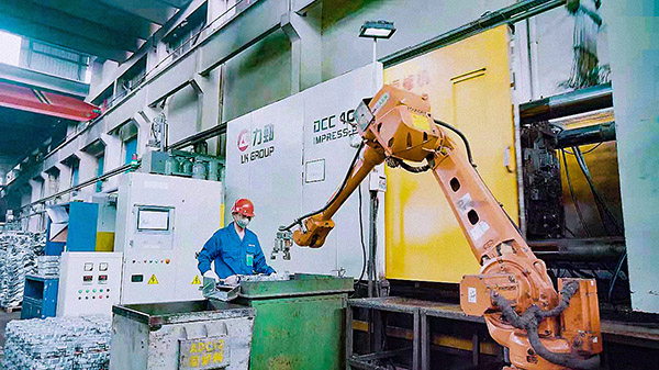 重慶惠正機械制造有限公司工作人員使用閉環控制及機器人操作鑄造機作業。重慶農商行供圖
