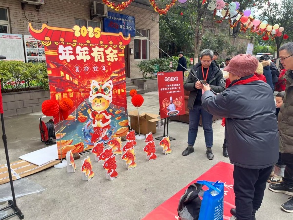上午9點,游園活動開始了。猜燈謎、釣魚、擲銅幣……一個個充滿童趣的游戲,吸引了社區居民爭相排隊,既玩游戲也得獎品。在另一旁,寫春聯、剪窗花、拍合照……一個個充滿著新年氛圍的活動也讓居民們笑開了花。