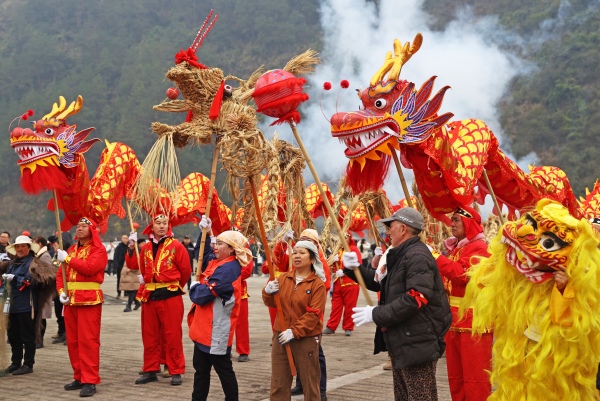 2月12日,彭水苗族土家族自治縣郁山鎮舞龍隊正在開展游街活動。趙勇攝