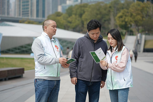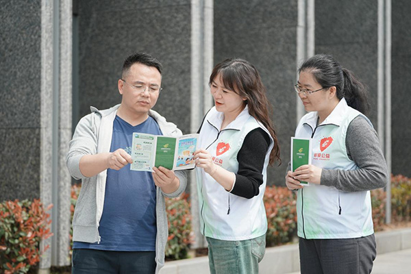 “阿姨,您好!我們正在開展‘郵愛公益’活動,只要您每天走5000步就能兌換公益金,幫助困難家庭學生完成學業?!被顒蝇F場,郵儲工作人員向沿途市民講解活動內容。