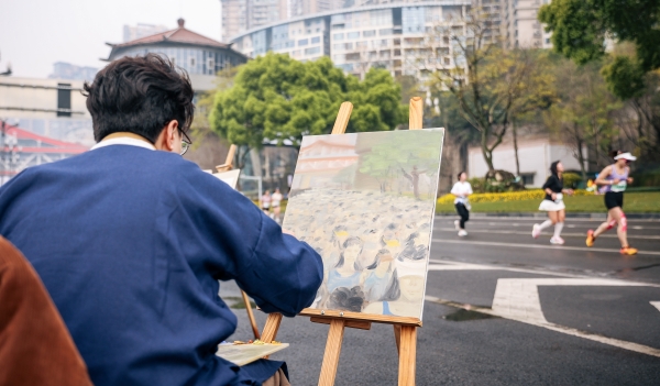不僅如此,江北區文化旅游委在賽道沿途創新設置徐悲鴻藝術速寫點加油站,從設計上融入徐悲鴻藝術街區特色元素,成為本次賽事的特色亮點之一。10名青年藝術家結合此次大賽主題,現場復刻徐悲鴻先生經典畫作,用筆描繪精彩賽事,展現出“她力量”與運動美學的完美交融。