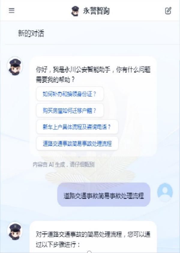 市民或企業只需關注“永川公安”微信公眾號,點擊“永警智詢”功能,便可通過文字對話形式,咨詢身份證補辦、交通事故處理、養犬登記、反詐知識等問題,平臺能實現秒級響應,并提供操作指引。此外,平臺還具備個性化服務能力,可根據用戶需求精準推薦業務辦理方案。