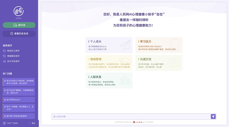 “自在”大模型依托人民日報社傳播內容認知全國重點實驗室開發,以“測評+咨詢”為核心功能,將人工智能技術與心理學專業知識相結合,致力于為家長和教師提供心理疏導、情緒管理、親子交流、家校共育等服務。