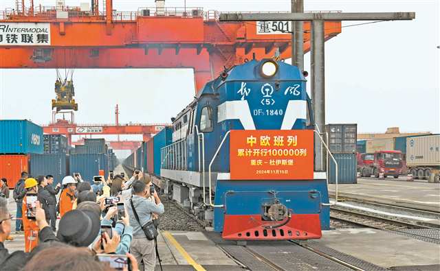 “中歐班列”第10萬班列車從沙坪壩區團結村站駛出。(攝于2024年11月15日)記者 張錦輝 攝/視覺重慶