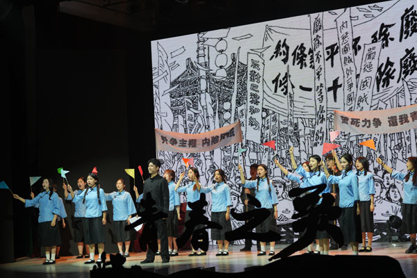 “1919年5月4日,五四愛國運動在北京爆發。5月24日,由川東師范學校牽頭發起,重慶聯中、巴縣中學等校學生組成的川東學生救國團正式成立,并發表《川東學生救國團宣言》,通電全國……”舞臺上,一群身著民國時期學生服裝的大學生,手拿一份“老報紙”,在重慶的“通遠門”前聚會,激情宣言。