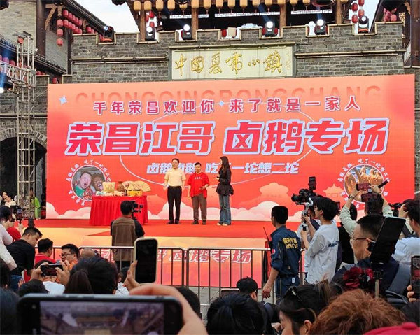 4月18日晚,“榮昌江哥”首場鹵鵝專場直播活動在榮昌夏布小鎮舉行,活動現場氣氛熱烈。來自全國各地的游客通過現場沉浸式體驗,深入了解非遺文化,品嘗當地特色美食?,F場的直播活動吸引了全國超過500萬名網友在線觀看,互動點贊量超過1000萬次,創下當地文化活動直播的新紀錄。