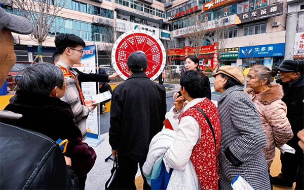 中國銀行重慶綦江支行設置“轉轉盤答題”趣味互動游戲,熱情、耐心地為過往群眾細致講解金融知識和權益保護要點,引導群眾參與游戲回答相關反詐問題,讓群眾在輕松愉快的氛圍里學習金融知識,提升自我保護意識。