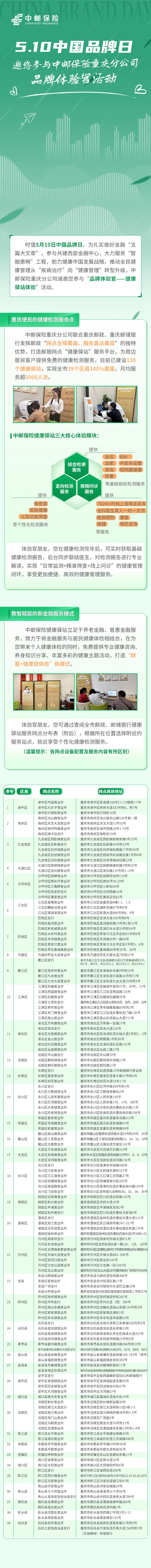5月10日中國品牌日,為助力健康中國發展戰略,推動全民健康管理從“疾病治療”向“健康管理”轉型升級,中郵保險重慶分公司誠邀您參與“品牌體驗官——健康驛站體驗”活動。(游晉宇)
