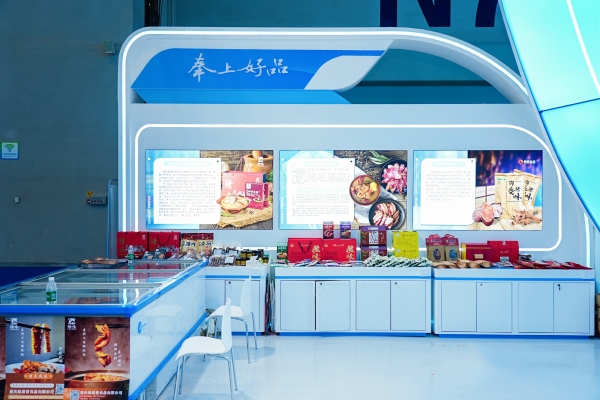 奉節館主題鮮明,生態工業與區域品牌雙輪驅動。以藍白為主色調,460平方米的現代化展區聚焦生態工業與特色產業協同發展。展區以“一核四鏈”為主線——“一核”即以多款地理標志產品為核心的“奉上好品”區域公共品牌,“四鏈”則延伸至農產品加工、眼鏡制造、清潔能源、文旅融合四大特色產業鏈。通過實物展陳、VR互動、非遺體驗等形式,生動呈現從“綠水青山”到“金山銀山”的轉化路徑,吸引大批客商駐足洽談。