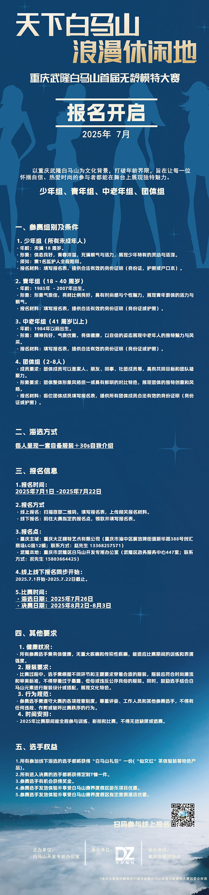 重慶武隆白馬山首屆無齡模特大賽 7月報名開啟。本次賽事以重慶武隆白馬山為文化背景,打破年齡界限,旨在讓每一位懷揣自信、熱愛時尚的參與者都能在舞臺上展現獨特魅力,分為少年組、青年組、中老年組、團體組。(李波)