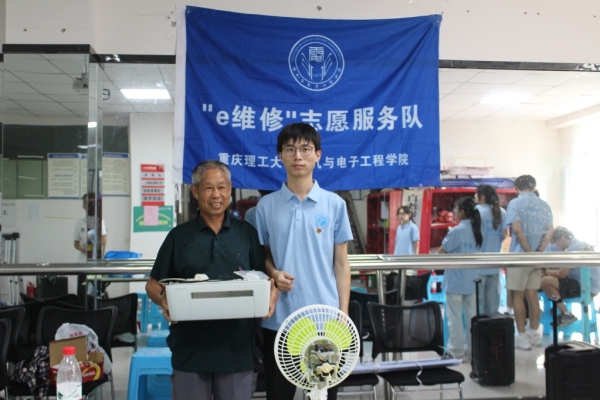 老伯抱著修好的打印機與志愿者合影。重慶理工大學供圖