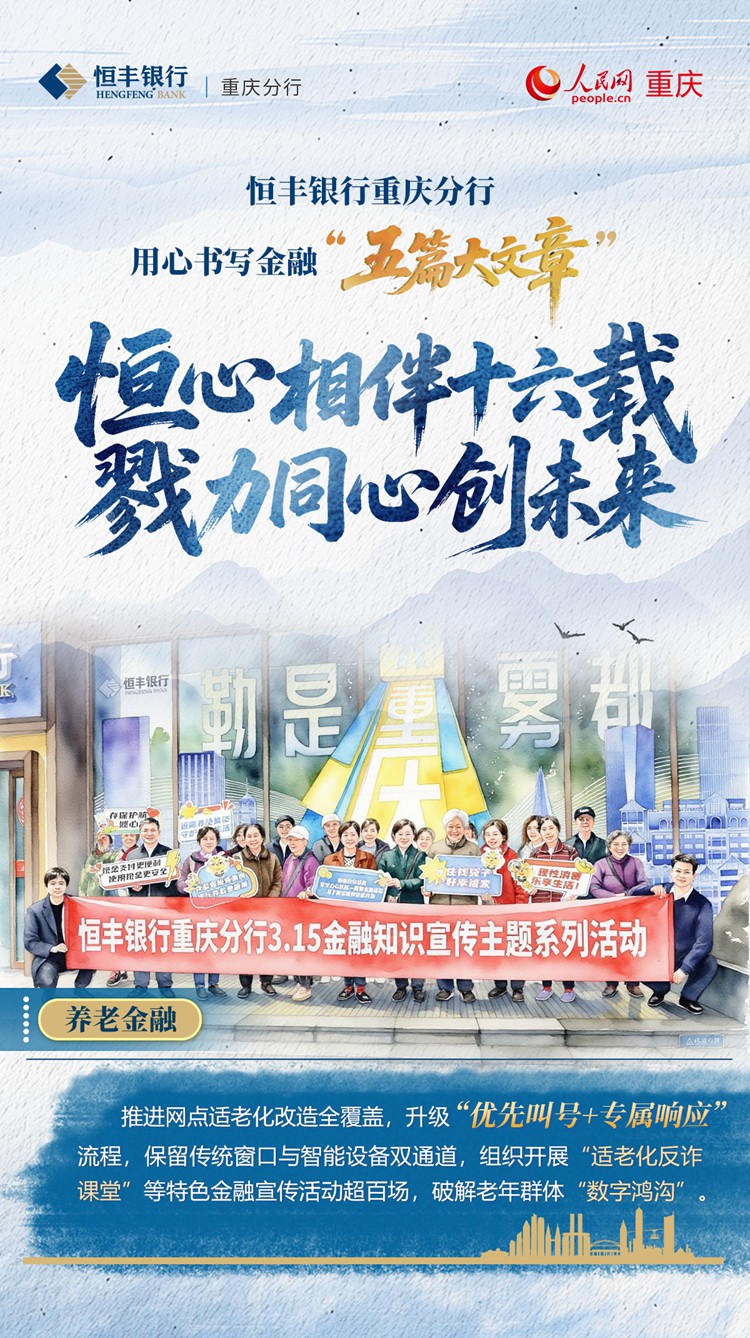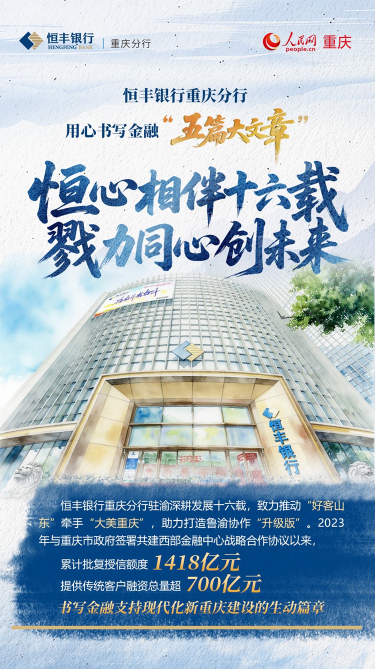 2025年8月7日,恒豐銀行重慶分行將迎來16周年行慶。人民網重慶頻道推出系列海報,展現恒豐銀行重慶分行做好金融“五篇大文章”的舉措與成效。