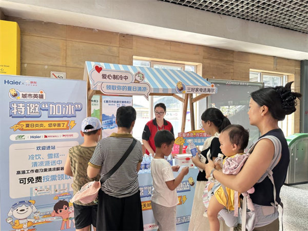 在京東電器入渝6周年之際,企業攜手重慶軌道運營公司、京東買藥、海爾等單位,發起“城市冰島計劃”大型公益活動,為高溫作業人員提供便捷的納涼補給服務。