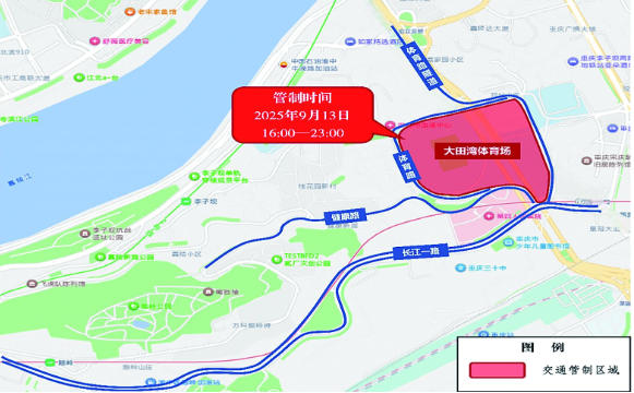 “新韻重慶 渝超同行”2025新鷗鵬重慶城市足球超級聯賽開幕戰,定于2025年9月13日(周六)19時至21時30分在重慶市渝中區大田灣體育場舉行。公安機關交通管理部門將對大田灣體育場周邊部分區域和關聯道路實施交通管制。