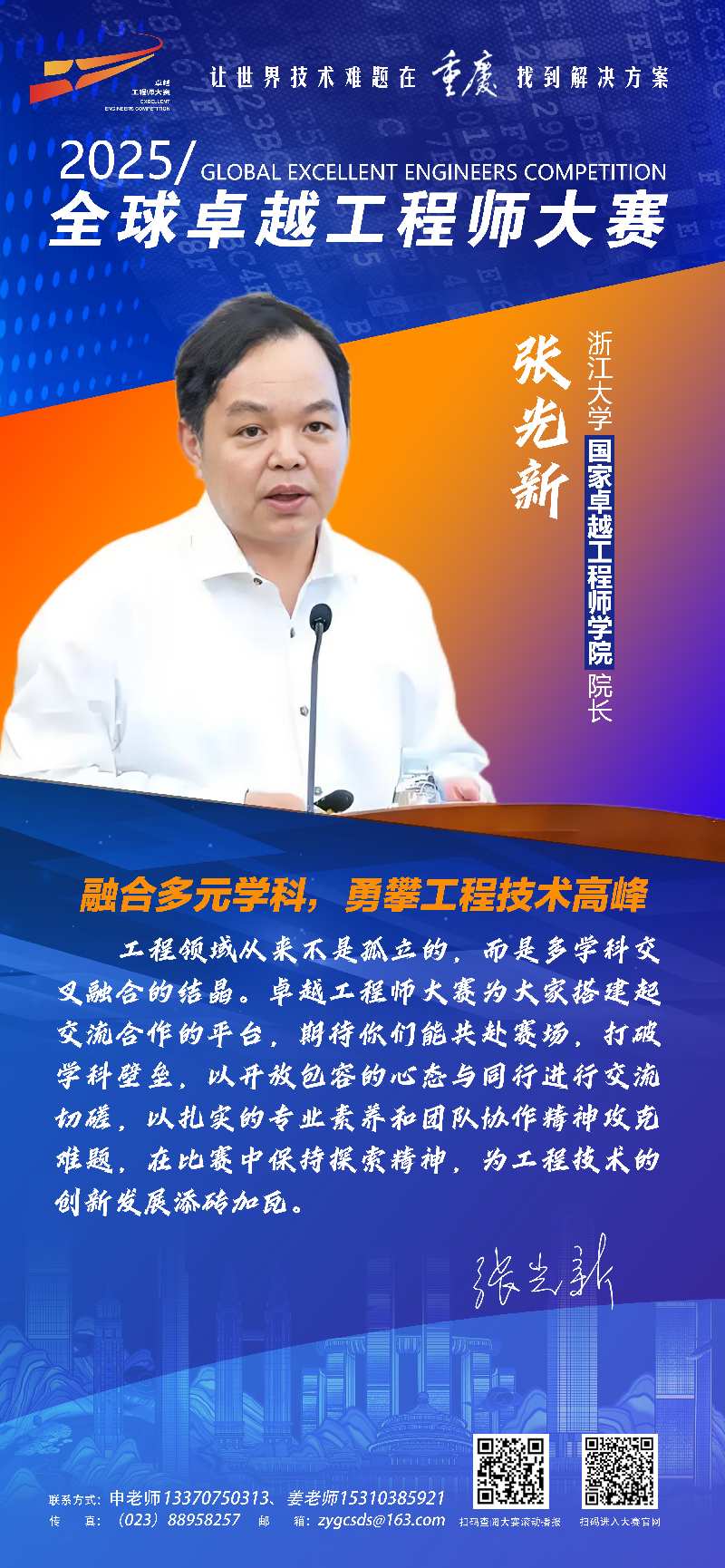 9月17日,浙江大學國家卓越工程師學院院長張光新向全球卓越工程師大賽·2025年度發來推介詞:工程領域從來不是孤立的,而是多學科交叉融合的結晶。卓越工程師大賽為大家搭建起交流合作的平臺,期待你們能共赴賽場,打破學科壁壘,以開放包容的心態與同行進行交流切磋,以扎實的專業素養和團隊協作精神攻克難題,在比賽中保持探索精神,為工程技術的創新發展添磚加瓦。