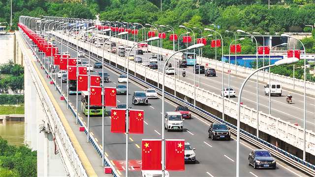 隨著國慶節臨近,包括重慶長江大橋在內,我市多處交通要道兩側陸續懸掛起了一面面五星紅旗,構成一道道美麗、和諧又喜慶的風景線。(特約攝影 鐘志兵/視覺重慶)