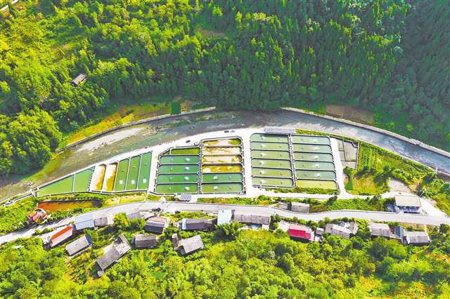 9月22日,治理后的馬喇河環繞著黔江區金洞鄉魚泉村的鱘魚養殖基地和民居(無人機照片)。