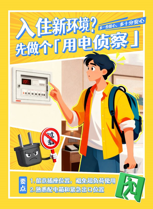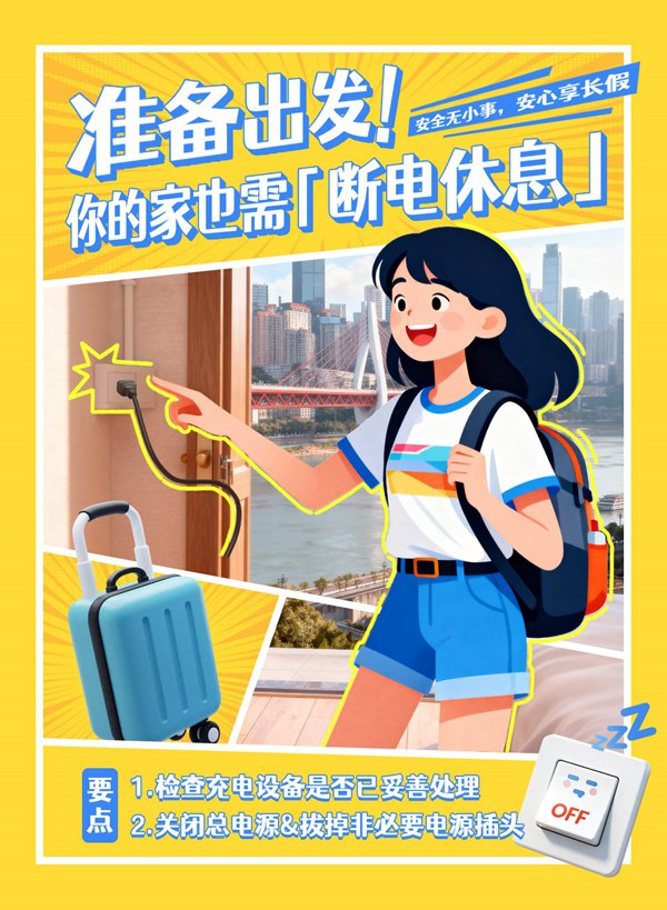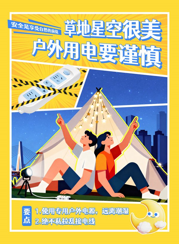 國慶、中秋雙節將至,家家戶戶團聚出游,用電安全可不能忽視!離開家前記得拔掉電器插頭,關閉總電源,避免雷雨天氣引發隱患;露營用電選擇戶外專用移動電源,照明燈具懸掛遠離帳篷布料;團聚時刻注意,不超負荷使用插座,遠離可燃物,使用合格電器產品,杜絕安全隱患。(全昕)