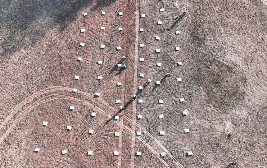 10月8日,酉陽縣銅鼓鎮銅西村九組,村民在渝湘復線高速臨時用地復墾現場進行土壤培肥作業(無人機照片)。
