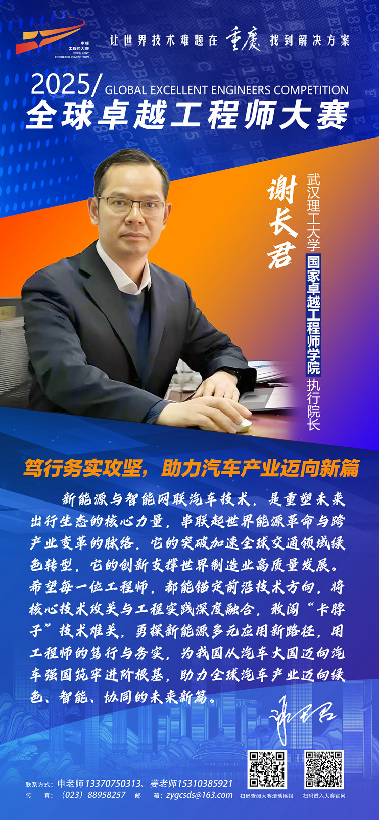 10月10日,武漢理工大學國家卓越工程師學院執行院長謝長君向全球卓越工程師大賽·2025年度發來推介詞:新能源與智能網聯汽車技術,是重塑未來出行生態的核心力量,串聯起世界能源革命與跨產業變革的脈絡,它的突破加速全球交通領域綠色轉型,它的創新支撐世界制造業高質量發展。希望每一位工程師,都能錨定前沿技術方向,將核心技術攻關與工程實踐深度融合,敢闖“卡脖子”技術難關,勇探新能源多元應用新路徑,用工程師的篤行與務實,為我國從汽車大國邁向汽車強國筑牢進階根基,助力全球汽車產業邁向綠色、智能、協同的未來新篇。