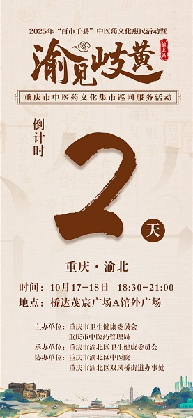 人民網重慶10月15日電 2025年“百市千縣”中醫藥文化惠民活動暨“渝見岐黃”重慶市中醫藥文化集市巡回服務渝北站活動,將于本周五、周六晚間在渝北茂宸廣場舉辦。屆時,市民可前往享受名中醫義診、體驗非遺中醫技藝、品嘗藥膳茶點、逛玩趣味中醫藥主題集市,近距離感受中醫藥文化魅力。