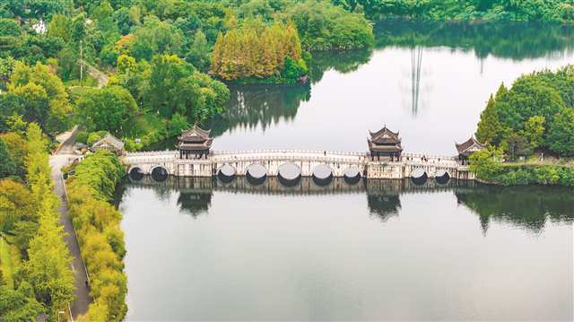10月27日,重慶園博園,湖水與樹林交相輝映,不少市民在園中休閑散步。